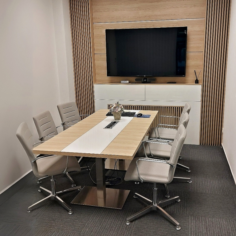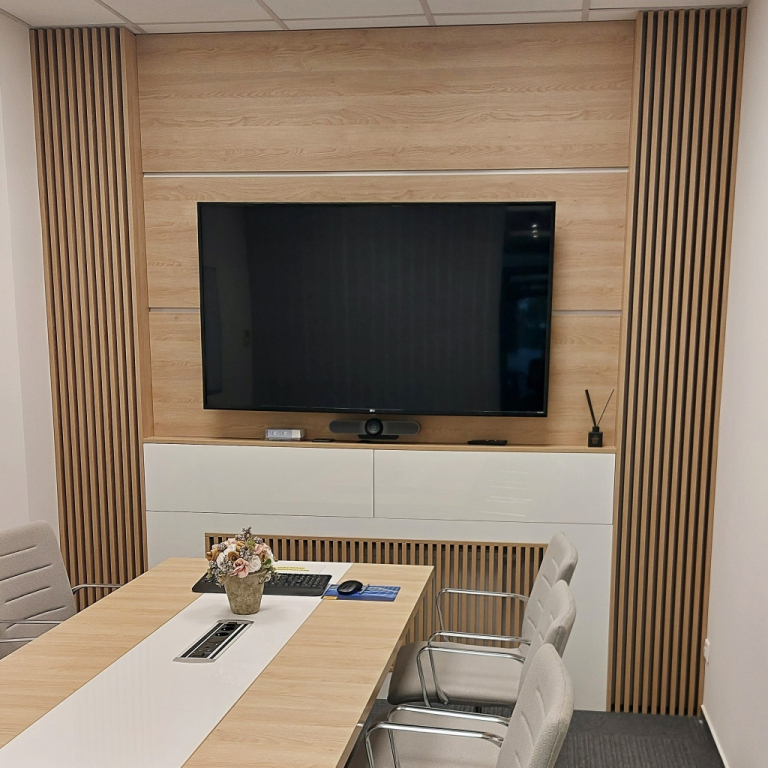 Zákazník nás znovu oslovil s atypickou zakázkou. Potřeboval vybavit menší zasedací místnost jednacím stolem pro cca 6 osob a židlemi, dále atypickým nábytkem včetně obložení stěny za TV obrazovkou. Součástí zakázky byl i 3D návrh a výroba atypických nábytkových a designových prvků. Přáním bylo sladit vše ve světlejším odstínu dubu v kombinaci s bílým leskem a šedou podlahou.
