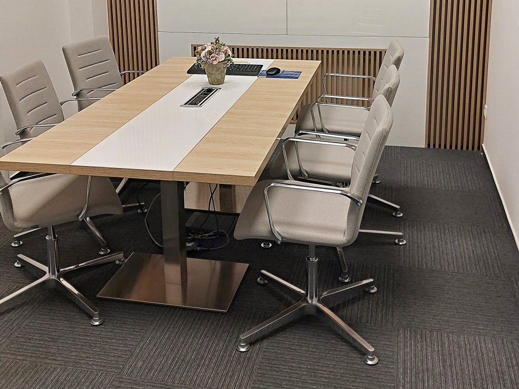 Jednací stůl na 2 centrálních podnožích, jsme doplnili o elektropanel, který umožní pohodlné připojení elektrotechniky, mobilních telefonů apod.