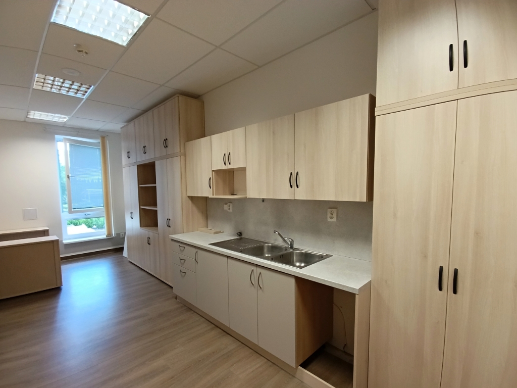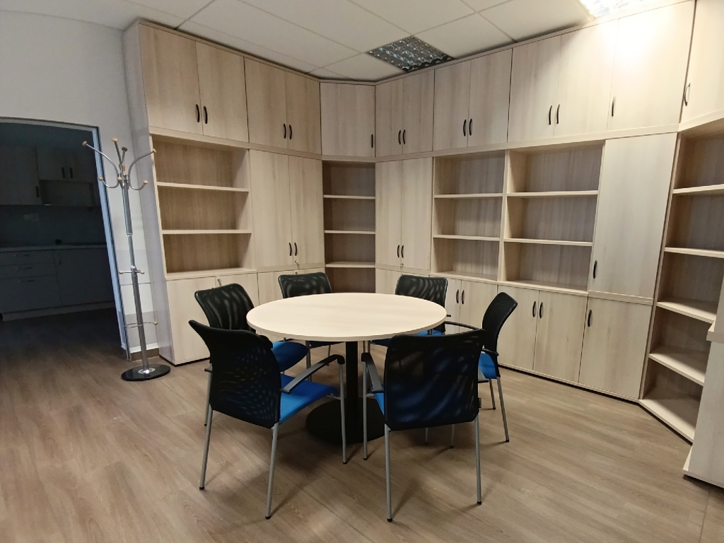 Zákazník nás po letech znovu oslovil s požadavkem na vybavení dvou navazujících místností nábytkem, židlemi, zřízením prostoru pro jednání šesti lidí, a také zřízením kuchyňského koutku. Přáním bylo sladit vše ve světlejším odstínu akátu v kombinaci s černými kovovými prvky, jako jsou především podnože stolů a úchytky skříní.