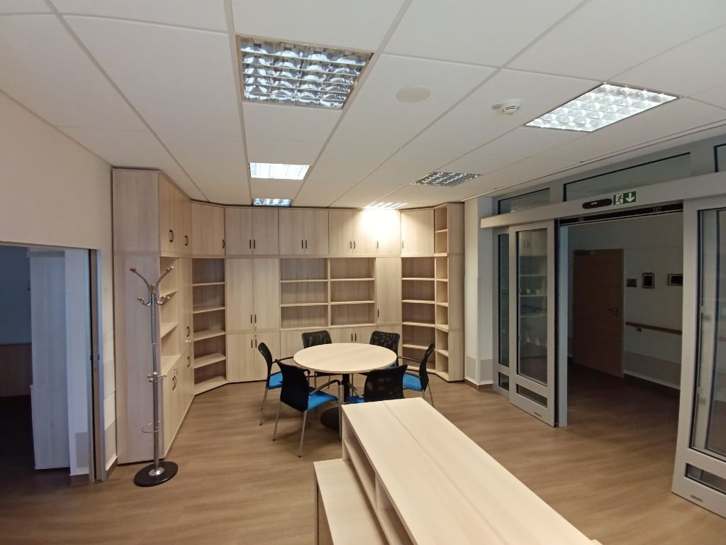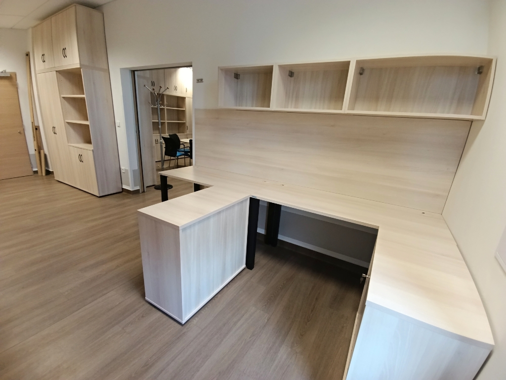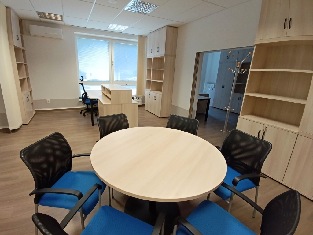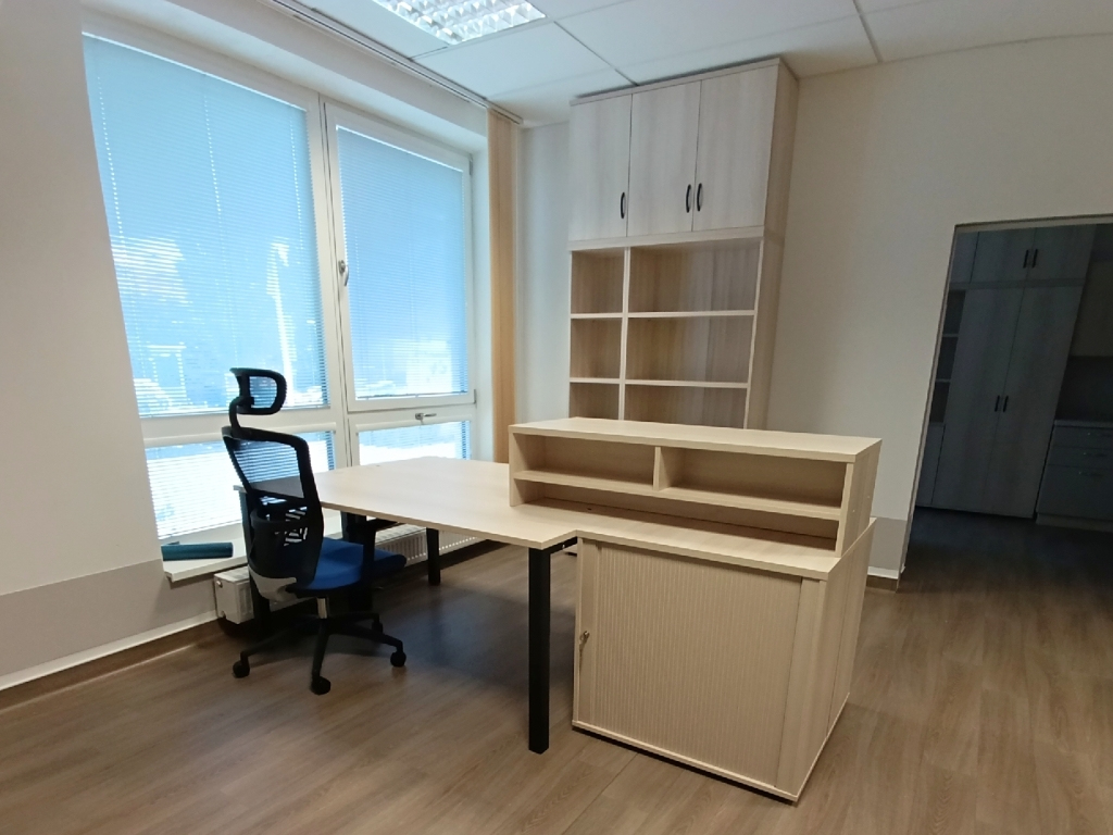 Zvolili jsme osvědčený a kvalitní nábytek značky Hobis v dekoru celoakát, podnože stolů v černé barvě a madla skříní UCO černá. Kruhový jednací stůl s centrální nohou byl doplněn šesti konferenčními židlemi Triton NET s modrým sedákem, jako pracovní židli jsme zvolili židli Themis s podhlavníkem a taktéž modrým sedákem.