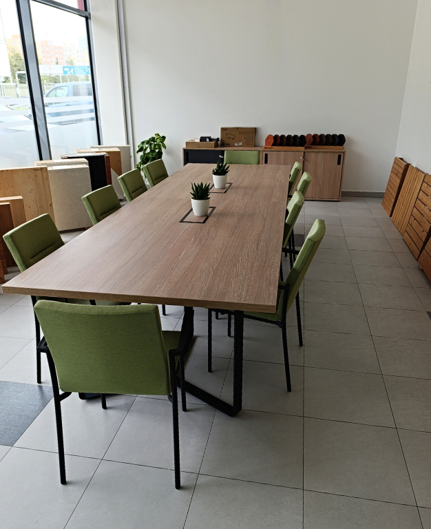 Jako jednací stůl jsme použili stůl PLANA 350x120 cm doplněný jednacími židlemi Seance Care na černé kostře se zeleným čalouněním. Tento nábytek jsme ještě doplnili nízkou skříňkou CHOICE 2 H s posuvnými dveřmi.