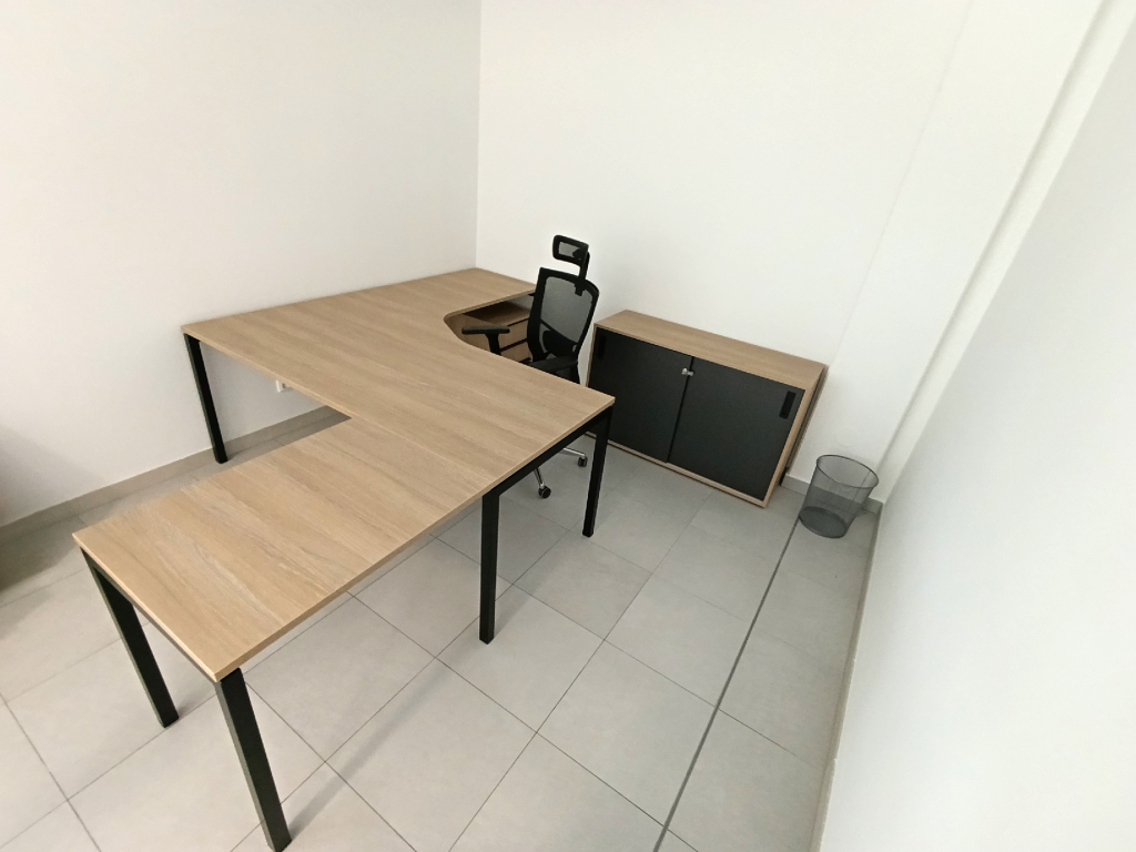 Kancelář jsme vybavili nábytkem řady NOVA: rohovým pracovním stolem NOVA U (P), jednacím doplňkovým stolem, pojízdným kontejnerem a nízkou skříňkou.